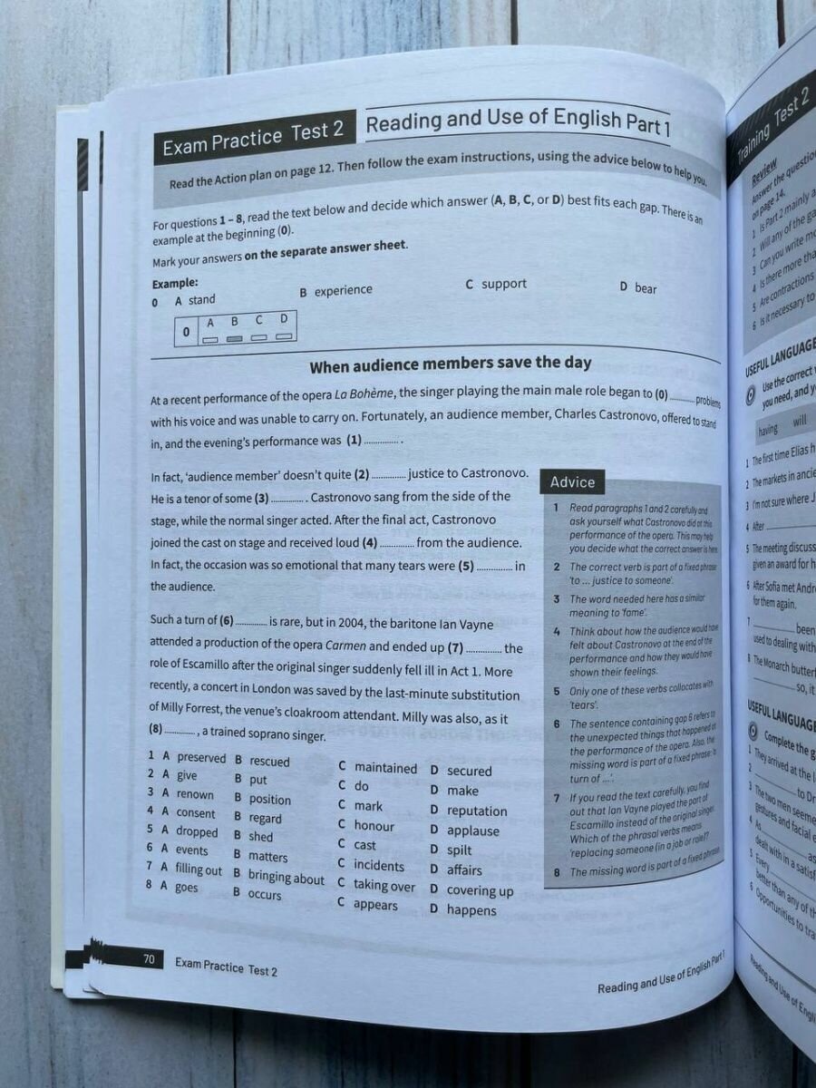 Полезная книга для кандидатов, желающих сдать С1 Advanced, включает в себя описание самого экзамена и советы по выполнению каждой его части. 6 полных тестов, 2 из которых подробно разобраны, книга с ответами. Подойдёт как для работы в классе так и для самостоятельной подготовки к экзамену. Внутри есть код доступа к аудио.