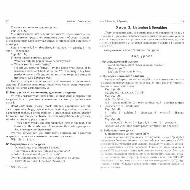 Поурочные разработки по английскому языку для 9 класса составлены по обновленному в соответствии с ФГОС учебнику Ю.Е. Ваулиной, Дж. Дули и др. "Английский в фокусе" / "Spotlight" (М.: Express Publishing: Просвещение, 2020); учебник включен в Федеральный перечень учебников, рекомендуемых Минпросвещения для использования в общеобразовательных организациях. Учитель найдет в пособии все необходимое для подготовки к каждому уроку, в том числе описание методических приемов для усвоения нового материала, задания для закрепления и повторения изученного материала, тестовые задания к каждому модулю учебника, а также подробные планы уроков для подготовки к письменной и устной частям ОГЭ.