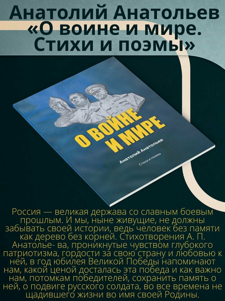 Россия - великая держава со славным боевым прошлым. И мы, ныне живущие, не должны забывать своей истории, ведь человек без памяти как дерево без корней. Стихотворения А.П. Анатольева, проникнутые чувством глубокого патриотизма, гордости за свою страну и любовью к ней, в год юбилея Великой Победы напоминают нам, какой ценой досталась эта победа и как важно нам, потомкам победителей, сохранить память о ней, о подвиге русского солдата, во все времена не щадившего жизни во имя своей Родины.