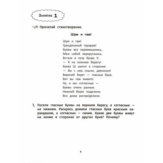 Пособие хорошо продумано и структурировано. В начале - инструкция по работе с пособием, затем собственно упражнения: один разворот - один урок, 46 уроков. Задания интересные, небанальные. Встречаются, конечно, однотипные, но по сути все задания разные. Беру не первое уже пособие этого автора, очень довольна: ребенку интересно, делает, как правило, не одно занятие, приходится даже останавливать. К печати претензий нет: формат А4, бумага достаточно плотная.