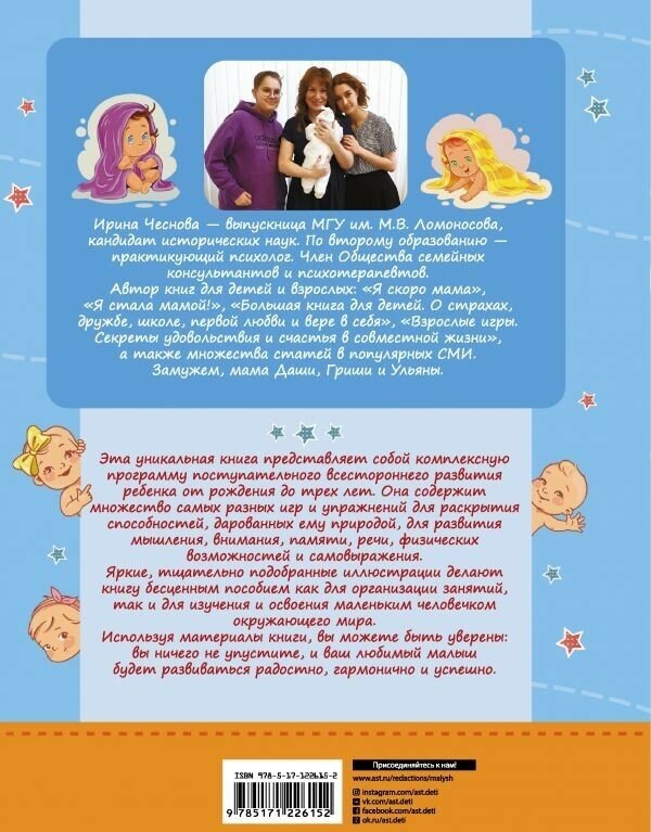 В первые годы жизни мозг маленького человека развивается колоссальными темпами. Важно не упустить момент и создать вокруг ребенка благоприятную среду для его гармоничного взросления и раскрытия способностей, дарованных природой. Книга опытного психолога, члена Общества семейных консультантов и психотерапевтов Ирины Чесновой содержит множество идей, игр и упражнений, которые помогут вам заниматься с малышом с первых дней его жизни и наполнить общение с ним взаимной радостью и удовольствием. Все вместе эти занятия составляют продуманную программу поступательного, комплексного развития ребенка от рождения до трех лет. Они заложат прочный фундамент для формирования хорошей памяти, устойчивого внимания, гибкого мышления и грамотной речи, чтобы малыш рос здоровым, смышленым, уверенным в своих силах и готовым решать сложные задачи, которые встретятся ему в жизни.