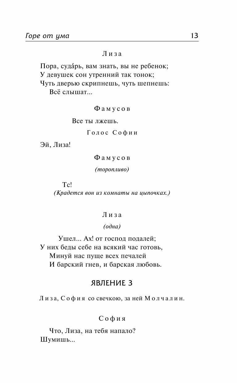 «Горе от ума» – шедевр русской литературы, произведение, разобранное на цитаты и крылатые фразы чуть ли не от первого до последнего слова. «Собрать бы книги все да сжечь», «карету мне, карету», «в деревню, к тетке, в глушь, в Саратов», «она к нему – а он ко мне»… Мы используем фразы из «Горя от ума» настолько часто, что даже не осознаем, что это – цитаты. Не потому ли горькая, язвительная и блестящая комедия Грибоедова по-прежнему актуальна и по сей день не сходит с лучших театральных сцен нашей страны?..