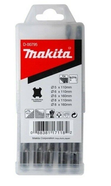Набор буров SDS-Plus Centering (5 шт; 6х110/8х160/10х160 мм) Makita B-54704 включет пять буров, предназначенных для сверления отверстий соответствующего диаметра в бетоне, кирпичной кладке, природном и искусственном камне. Монолитная твердосплавная головка буров с центрирующим острием обеспечивает высокоточное засверливание и стабильное ведение сверла в отверстии.