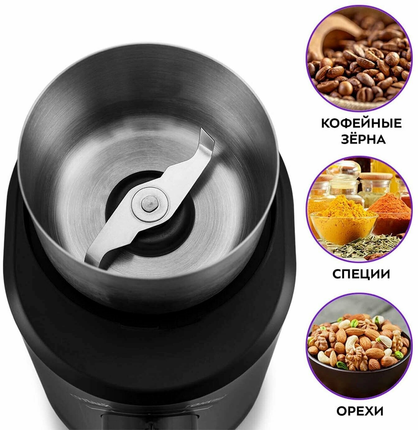 Мощная кофемолка КТ-747 с электронным управлением предназначена для помола кофейных зёрен и измельчения специй и орехов. В чаше установлен двухлезвийный нож-дробилка для эффективного измельчения. Кофемолка укомплектована съёмной чашей из нержавеющей стали и прозрачной крышкой, а на дне есть специальные прорезиненные нескользящие ножки.