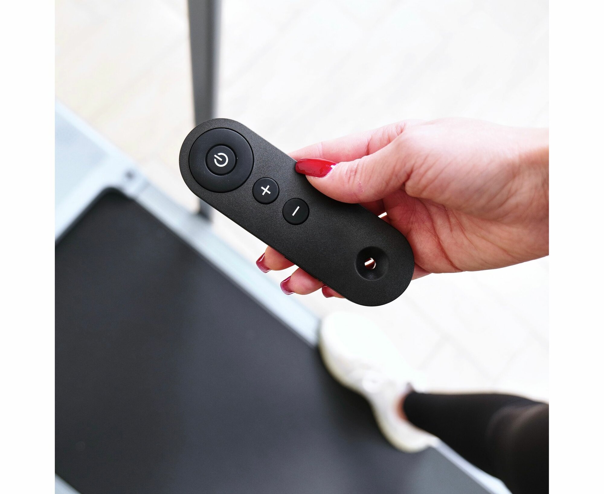 У беговой дорожки DFC SLIM нет привычной консоли. Управление происходит с помощью дистанционного пулта управления (ДУ), или через приложение, установленное на ваш смартфон или планшет. Здесь установлен удобный складной поручень с держателем под девайс и пульт.