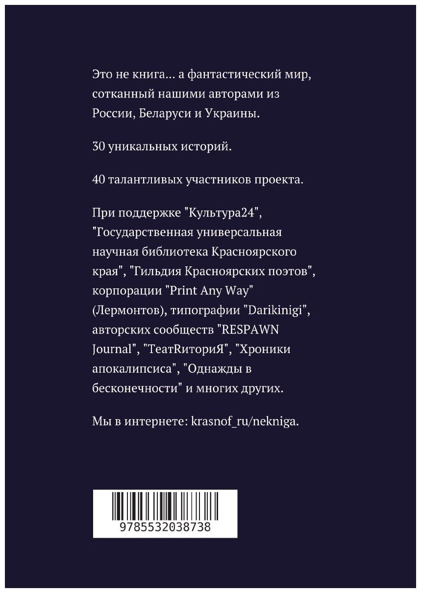 Это не книга… а фантастический мир, сотканный нашими авторами из России, Беларуси и Украины. 30 уникальных историй. 40 талантливых участников проекта. При поддержке "Культура24", "Государственная универсальная научная библиотека Красноярского края", "Гильдия Красноярских поэтов", корпорации "Print Any Way" (Лермонтов), типографии "Darikinigi", авторских сообществ "RESPAWN Journal", "ТеатRиториЯ", "Хроники апокалипсиса", "Однажды в бесконечности" и многих других. Мы в интернете: krasnof_ru/nekniga.