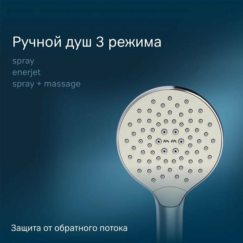 | В комплекте | верхний душ, держатель, штанга, смеситель, душевой шланг, керамический картридж (AM.PM Soft Motion 35 мм), лейка ручная, излив, аэратор, обратный клапан |