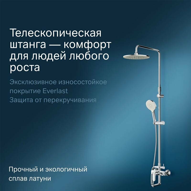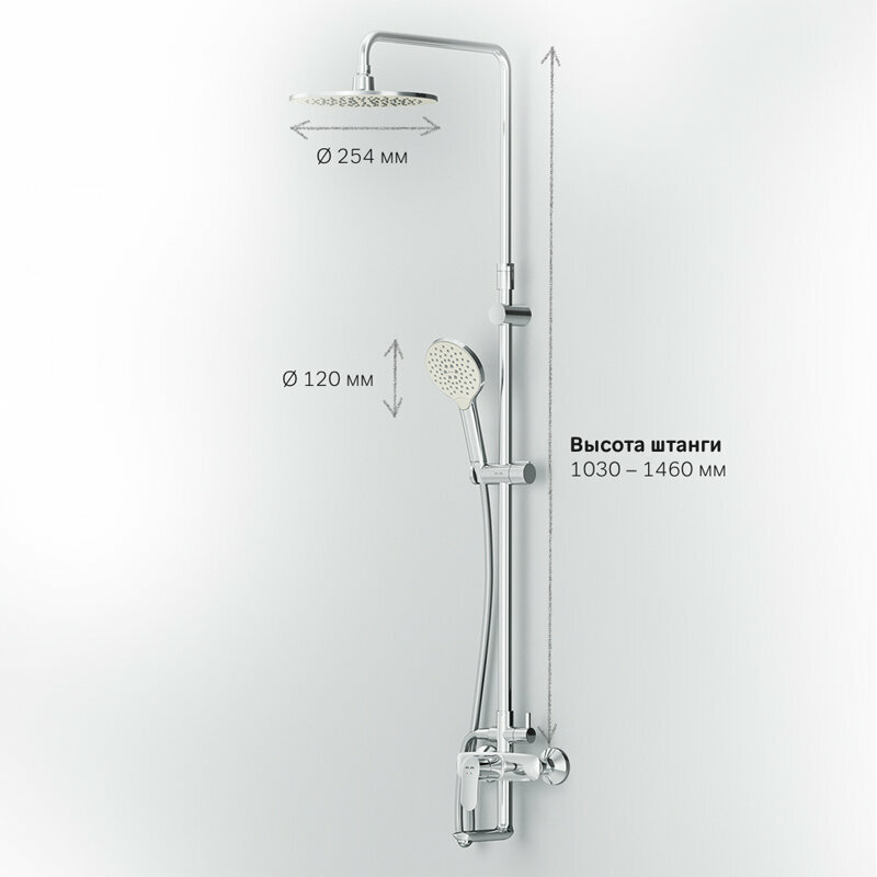 Премиальные размеры и продуманные детали: увеличенный диаметр душевых леек (верхний душ 254 мм и ручной душ 120 мм) позволит ощутить преимущества тропического душа, тогда как увеличенная длина шланга 1750 мм обеспечит свободу движений во время принятия душа. Телескопическая поворотная штанга регулируется по высоте в диапазоне от 1030 до 1460 мм, обеспечивая комфорт для людей любого роста, а шаровый шарнир в держателе верхнего душа позволяет регулировать угол его наклона.