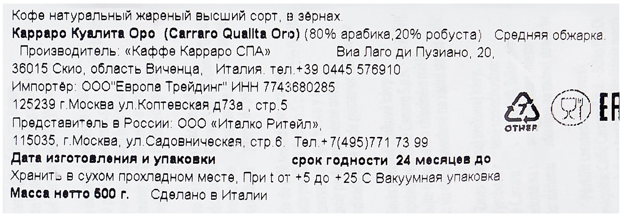 На сегодняшний день товар «Кофе в зернах Carraro Caffe Carraro Qualita Oro 500гр.» можно купить с кешбеком в 1 магазине: Яндекс.Маркет