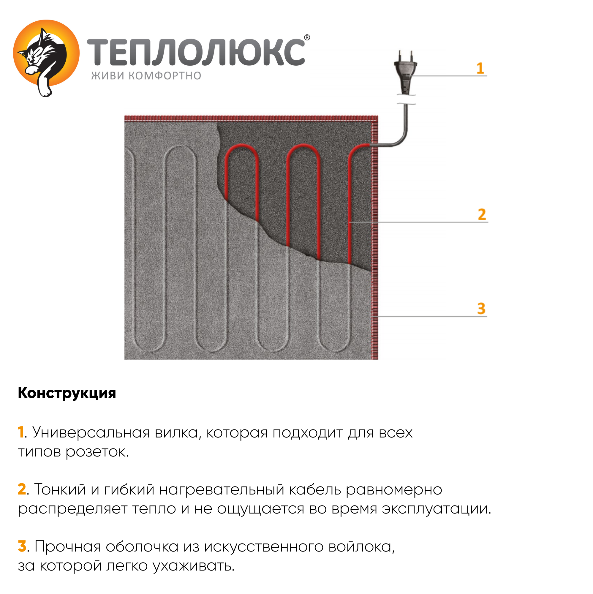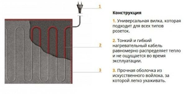 - Монтаж: укладывается на пол, накрывается ковром, подключается к электросети.
