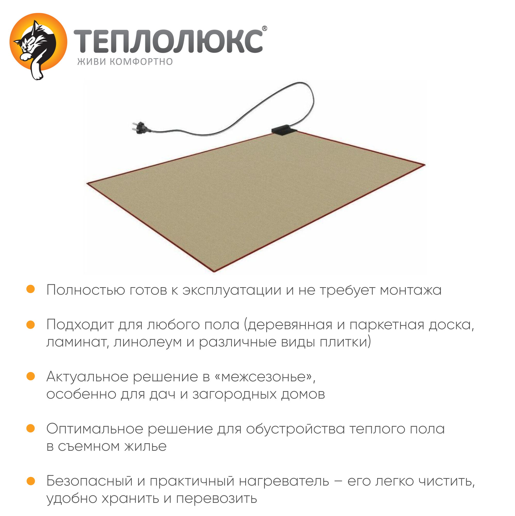 Теплолюкс Express — простое и универсальное решение для дома и дачи. Он укладывается прямо на пол, накрывается ковром, включается в сеть – и теплый пол к Вашим услугам! Теплолюкс Express можно перевозить с собой из городской квартиры на дачу, можно использовать в разных комнатах, удобно хранить. Теплолюкс Express представляет собой нагревательный мат на основе тонкого нагревательного кабеля в герметичной защитной оболочке, оснащенный установочным проводом длиной 2,5 метра.
