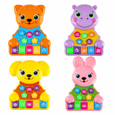 Во время звучания у зайчика светятся щечки. А при нажатии на цветные клавиши ребенок сможет поиграть на пианино и послушать голоса зверят (пианино работает в двух режимах).