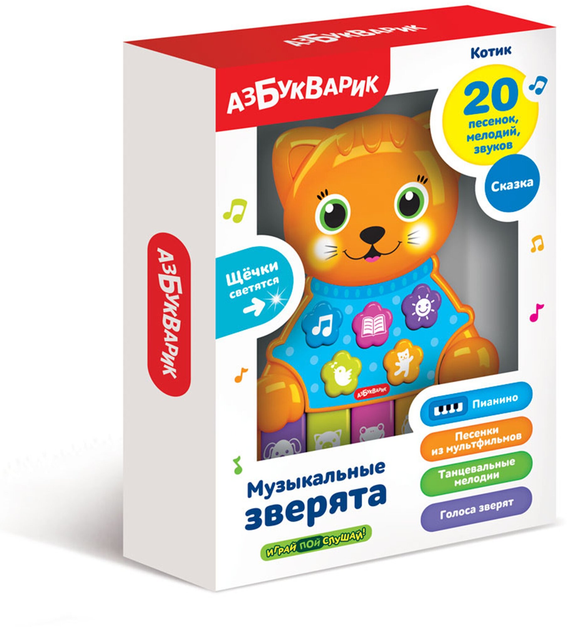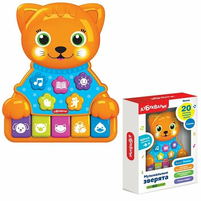 Во время звучания у котика светятся щечки. А при нажатии на цветные клавиши ребенок сможет поиграть на пианино и послушать голоса зверят (пианино работает в двух режимах).