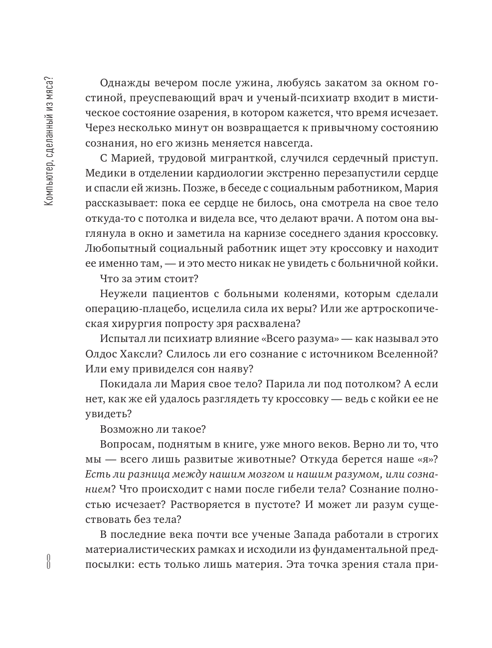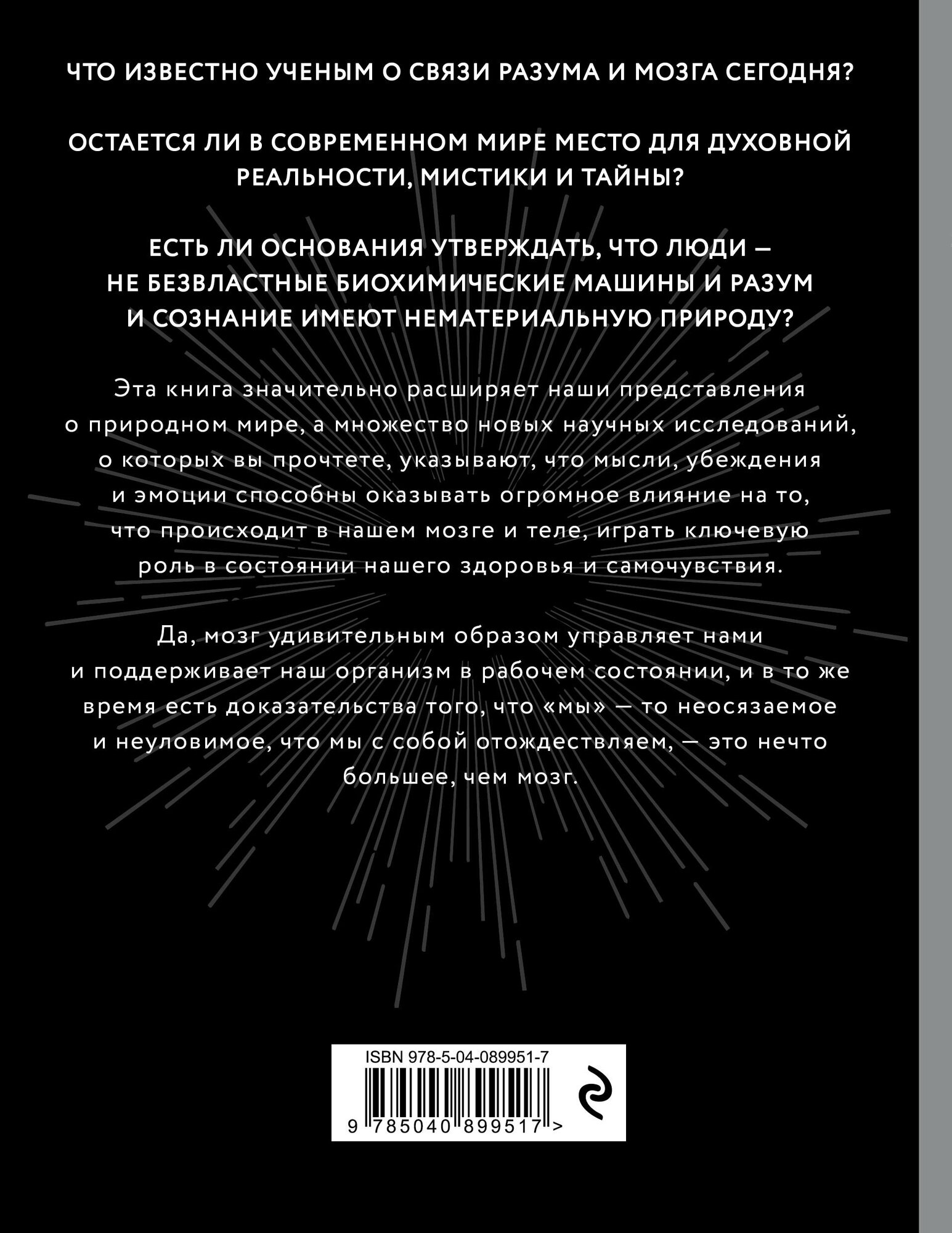 Согласно материалистическому мировоззрению, наше сознание, наши смыслы и ценности - всего лишь химические процессы и электрические импульсы. Автор утверждает, что не все так однозначно, и главенствующее сейчас в науке материалистическое мировоззрение занимает не такую уж устойчивую позицию. Борегар дает обзор исследований, приводит интересные результаты и выводы ученых о силе разума, природе сознания и реальности.