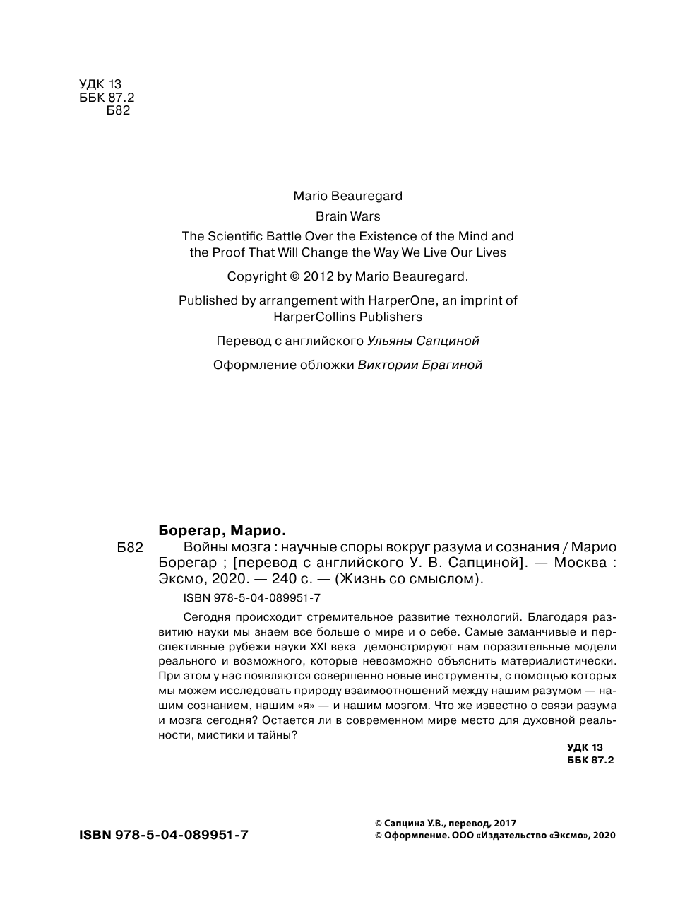 Войны мозга. Научные споры вокруг разума и сознания (Борегар Марио); ООО "Издательство "Эксмо", 2020