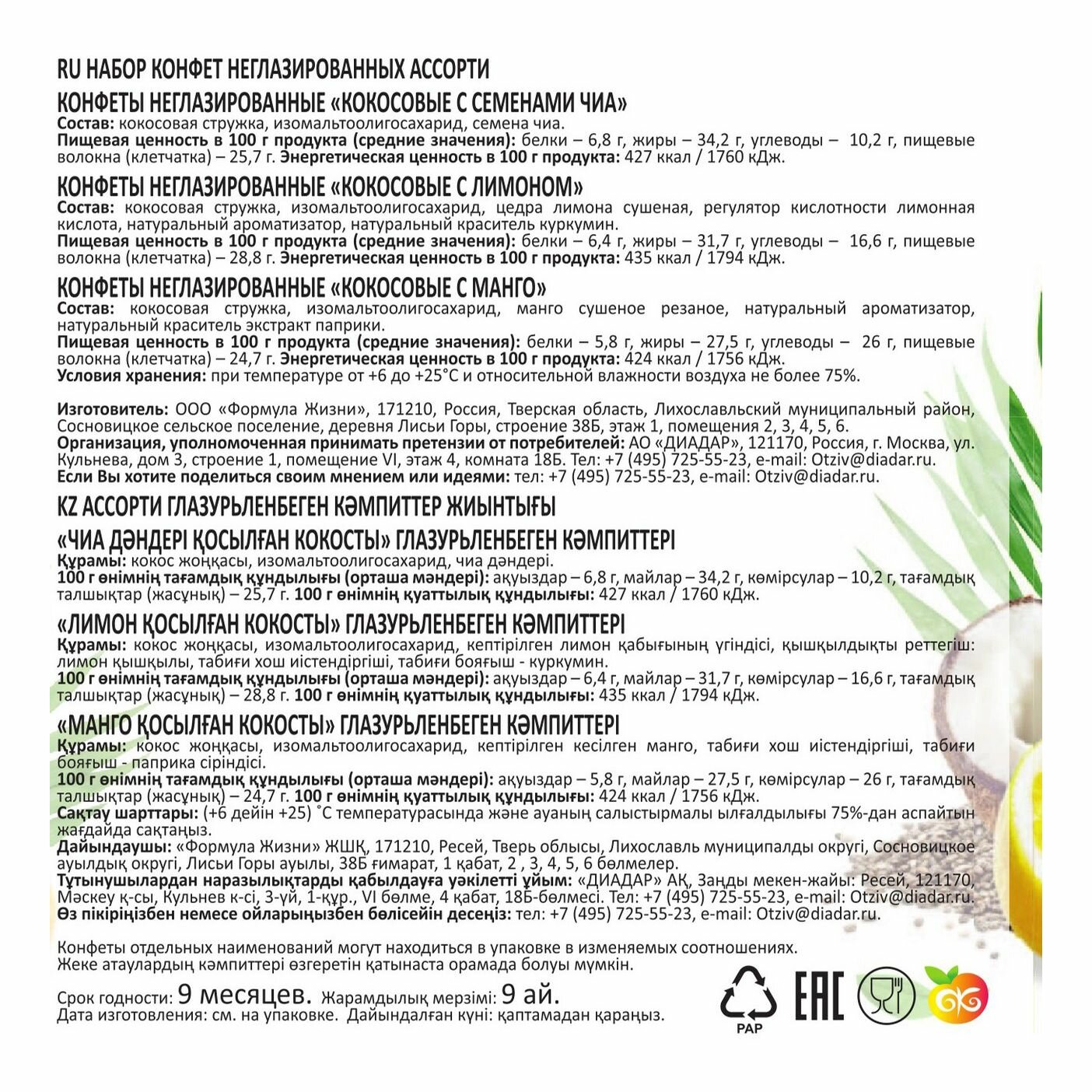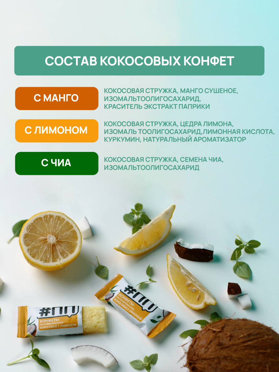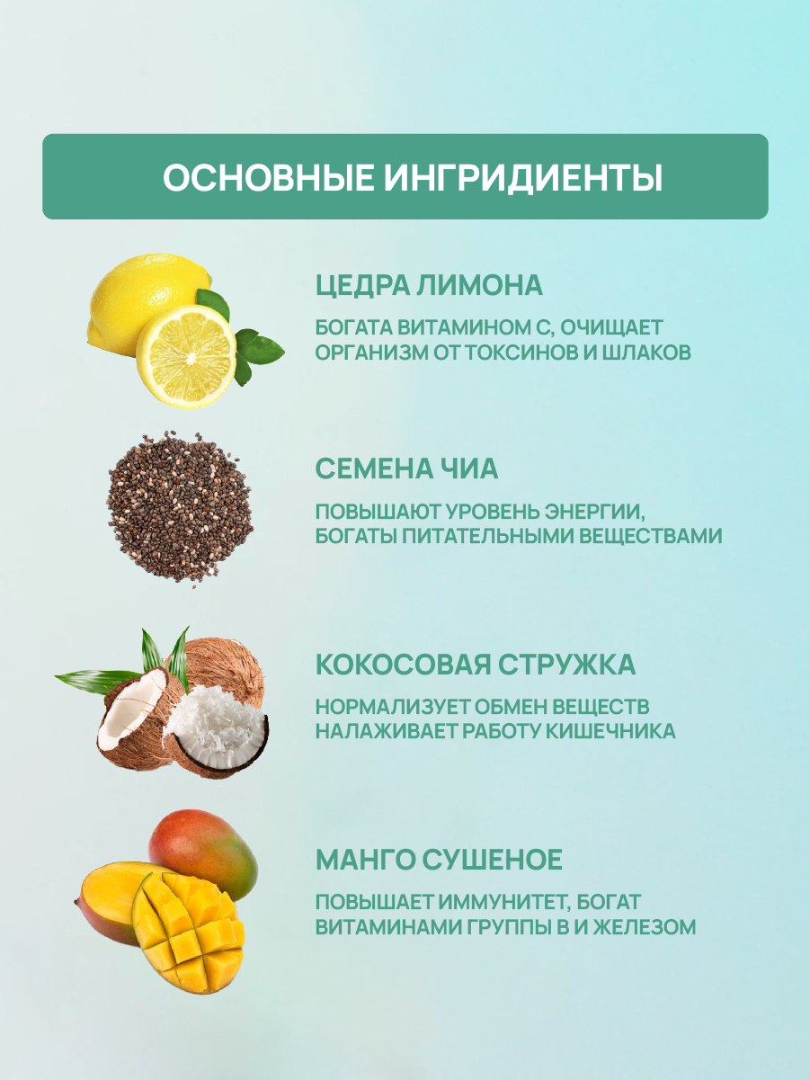 | Состав | кокосовая стружка, лимона цедра, чиа семена, манго, куркумин, паприки экстракт, изомальтоолигосахарид, ароматизатор натуральный |