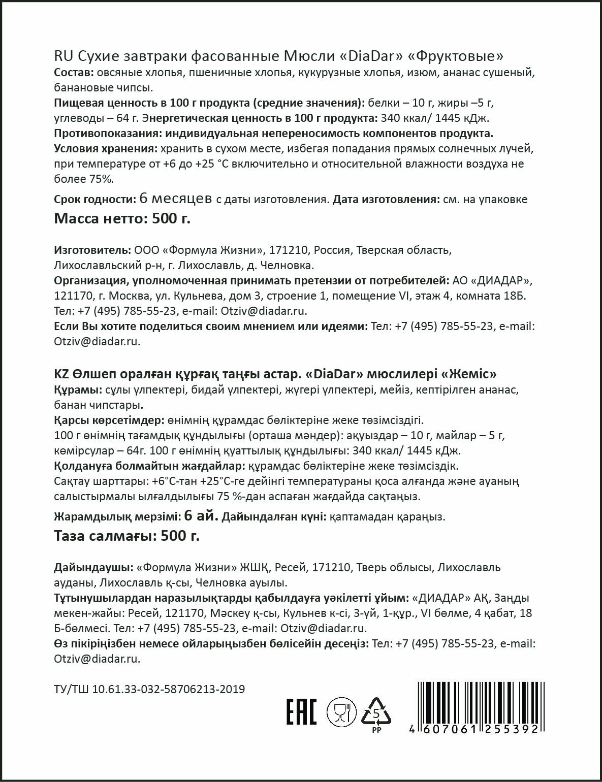 Мюсли DiaDar Фруктовые 500г Формула Жизни