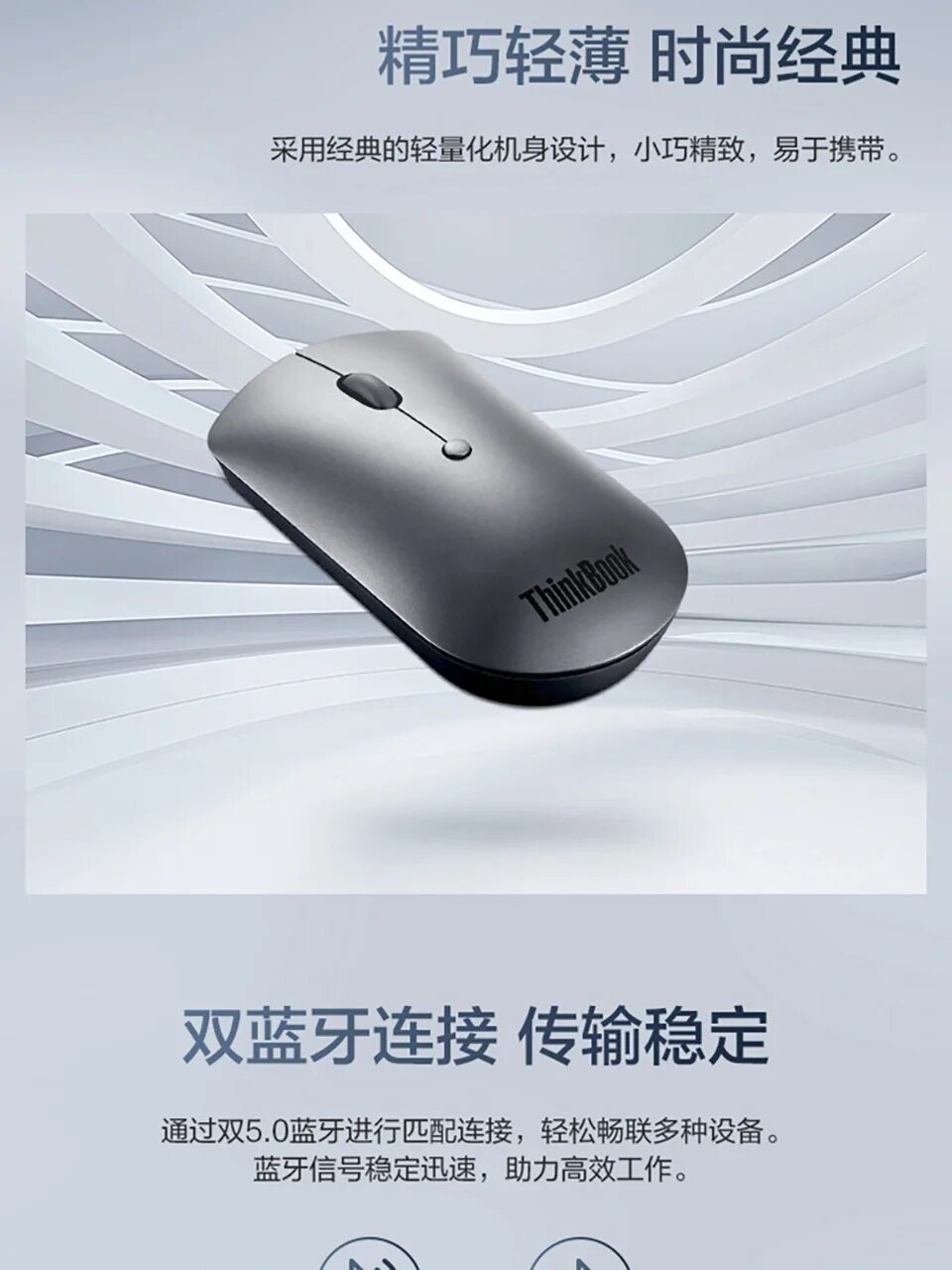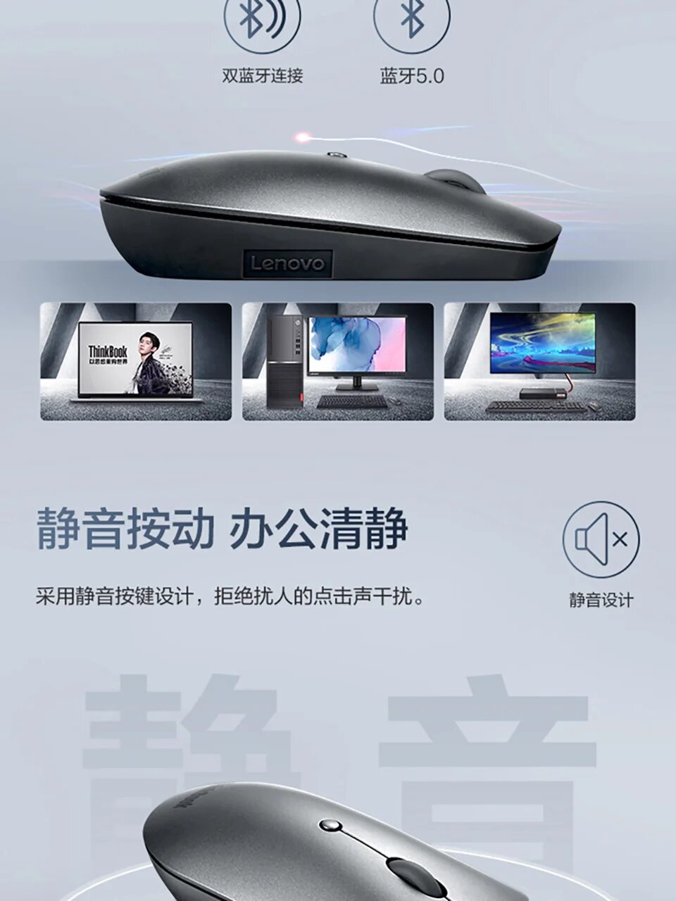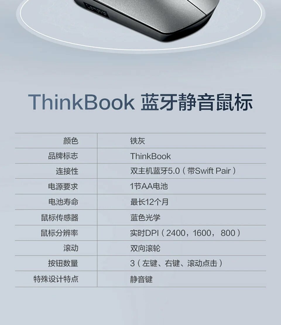 | Прочее | ThinkBook Bluetooth Silent Mouse берет за основу привычную концепцию и переворачивает ее с ног на голову, создавая производительное устройство, которое не мешает занятым профессионалам, которые его используют. Благодаря низкопрофильному минималистичному дизайну, мышь легко переносится и помещается в карманы. Делайте больше с оптическим датчиком, который позволяет работать на большинстве поверхностей, революционными бесшумными кнопками, не отвлекающими внимания, и регулируемыми элементами управления DPI на лету. С легкостью сопрягайте до двух устройств одновременно и быстро переключайтесь между ними одним нажатием кнопки благодаря Bluetooth 5.0 и технологии Microsoft Swift Pair. |
