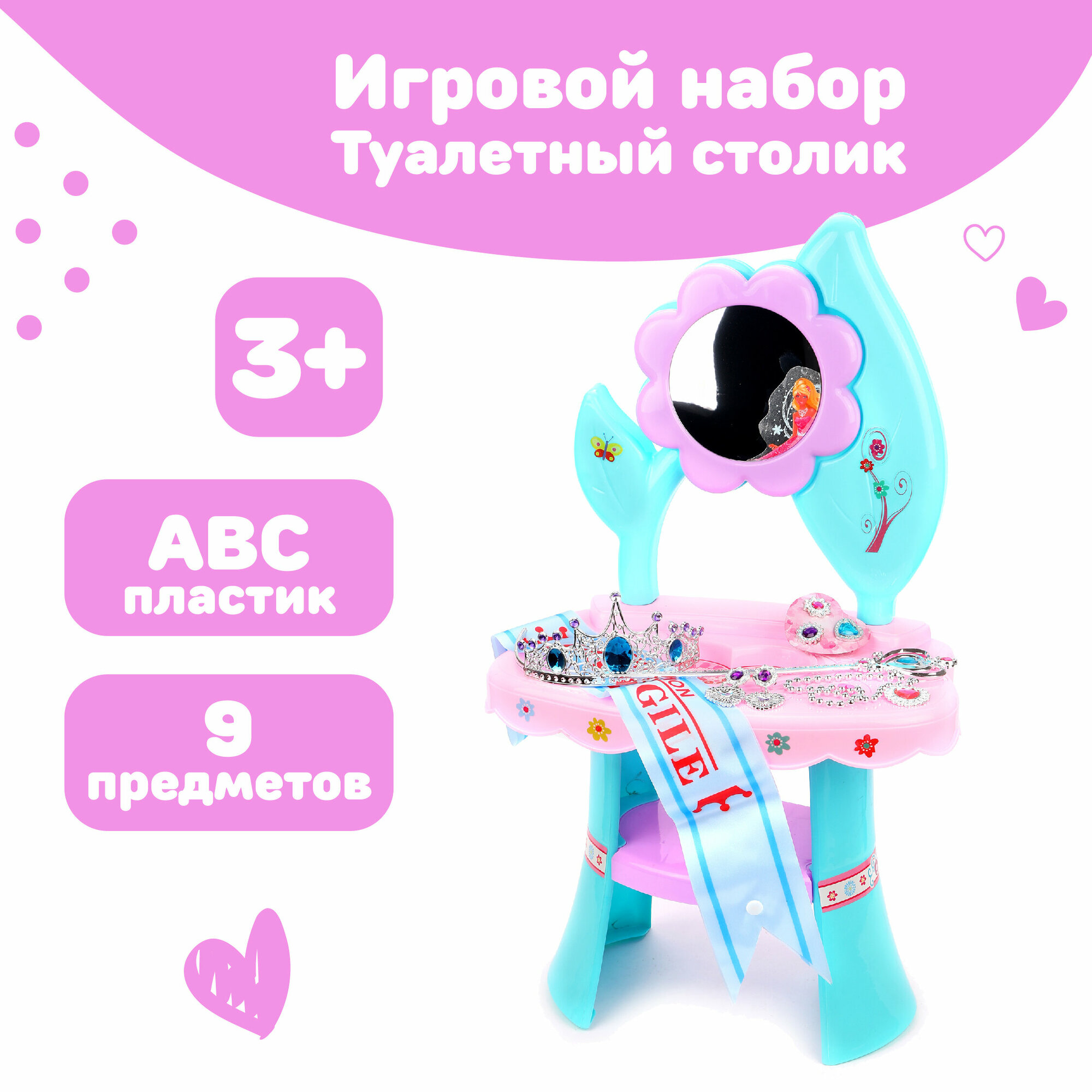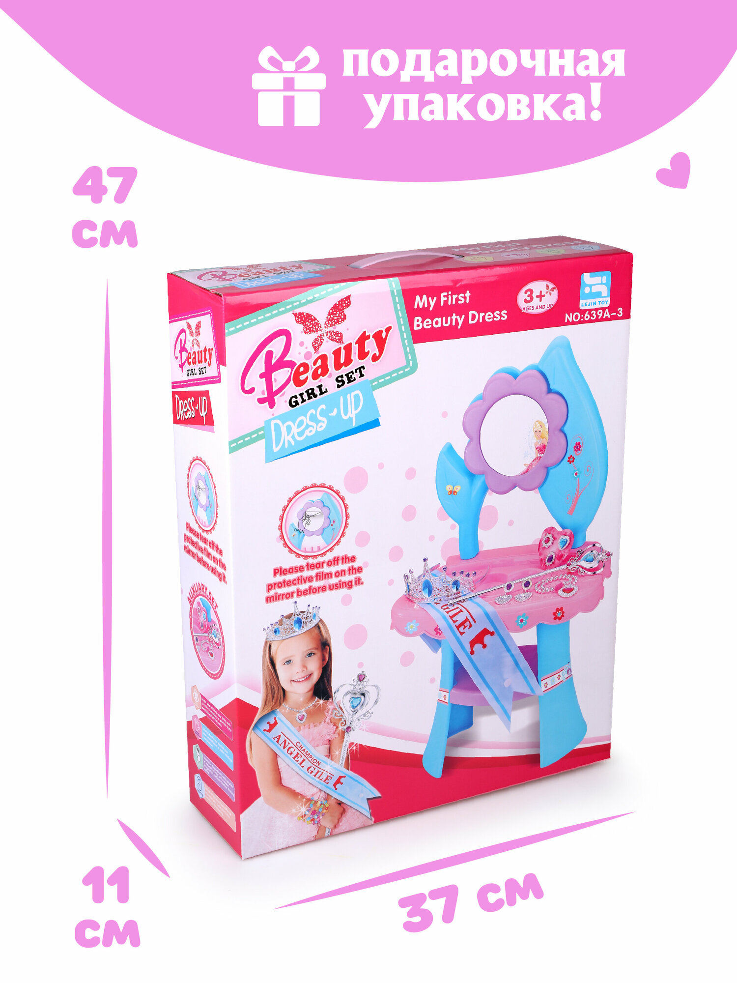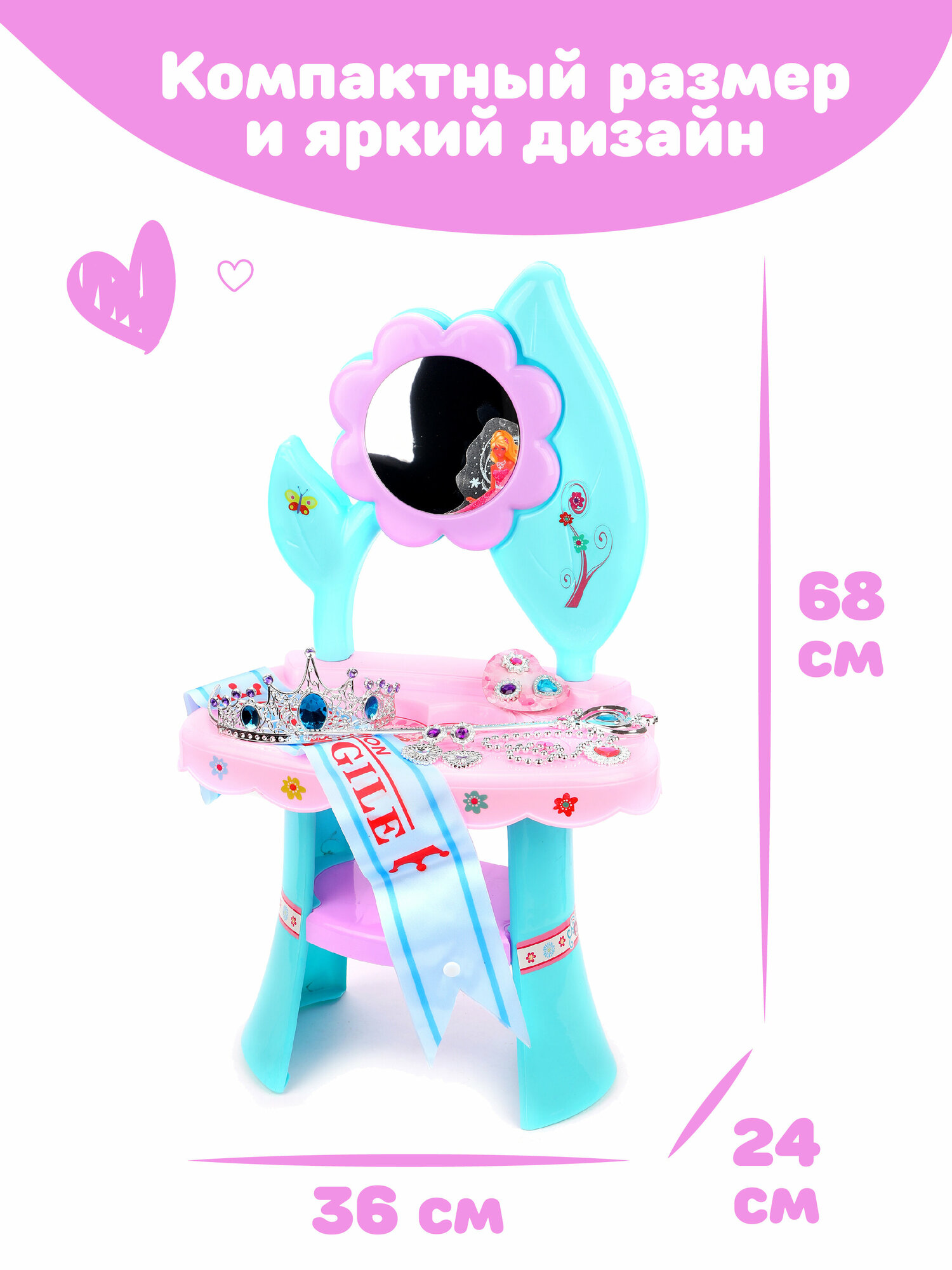 В составе набора: туалетный столик с безопасным зеркальцем, выполненным в форме цветка, и модные девчачьи аксессуары: лента, волшебная палочка, диадема, 3 колечка с регулируемым диаметром, серьги-клипсы, бусы, подвеска.