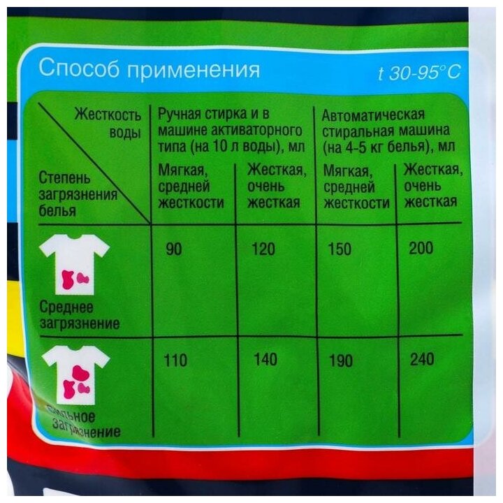 Для стирки изделий из хлопчатобумажных, льняных, синтетических тканей, а также тканей из смешанных волокон (кроме изделий из натурального шелка и шерсти). Подходит как для ручной стирки, так и для стирки в автоматической стиральной машине.