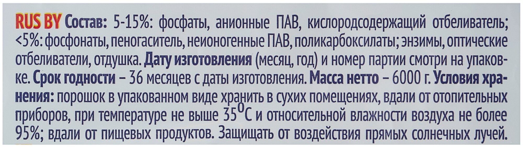 | Состав | сульфаты (15-30%), карбонаты (5-15%), фосфаты (5-15%), анионные пав (5-15%), кислородсодержащие отбеливающие вещества (5-15%), силикаты (5-15%), неионогенные пав (<5%), пеногаситель (<5%), фосфонаты (<5%), антиресорбенты (<5%), поликарбоксилаты (<5%), энзимы, отдушка, оптические отбеливатели |