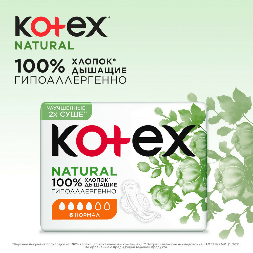 Женские гигиенические прокладки Kotex Natural НОРМАЛ Новые прокладки Kotex Natural НОРМАЛ для умеренных выделений обеспечивают комфорт и уверенность до 100%. 100% ХЛОПОК* ГИПОАЛЛЕРГЕННО** дерматологически протестировано** 0% пластика, хлора, красителей в верхнем слое, соприкасающимся с твоей чувствительной кожей* Уникальный 3D центр быстро впитывает Прокладка лучше прилегает к телу до 0% протеканий*** Мягкие крылышки, надежно крепятся к белью и не натирают кожу Эстетичная форма прокладки и нежный женственный дизайн добавят удовольствия при использовании *Верхнее покрытие прокладки из 100% хлопка (за исключением крылышек). **CPTC, Inc. NJ, США/АҚШ, Март/Наурыз/Березень 2020. ***Опрос потребителей. Россия. 2019. По сравнению с предыдущей линейкой Котекс Ультра Нормал. Уникальный 3D центр быстро впитывает