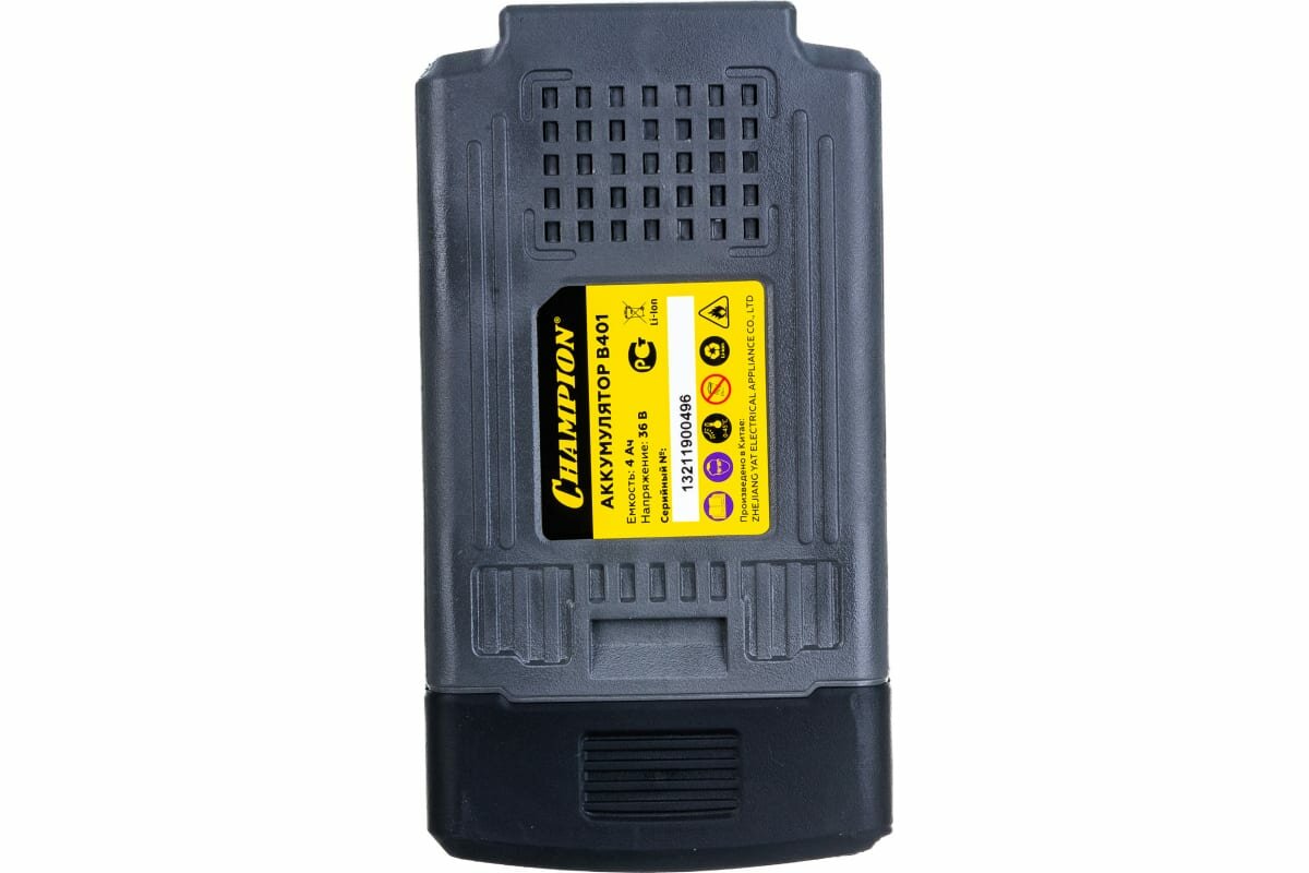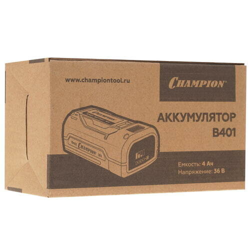Аккумулятор Champion B401 подходит для всей линейки аккумуляторной техники CHAMPION. Емкость аккумулятора 4 Ah, напряжение - 36V. Время зарядки аккумулятора составляет 2.5 ч. Температура хранения от +10°С до +20°С.