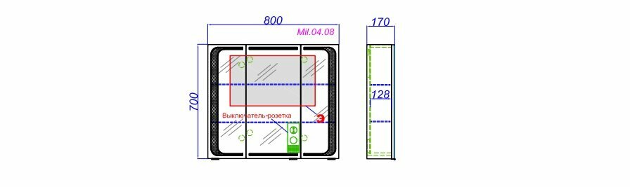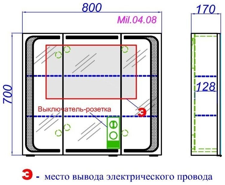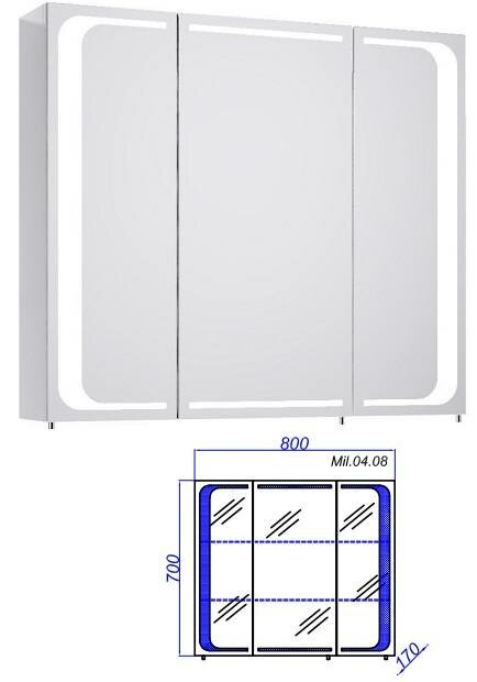 Зеркальный шкаф оснащен:светодиодной подсветкой по периметру, внутренним блоком розетка, выключатель. Тип лампы-светодиодная