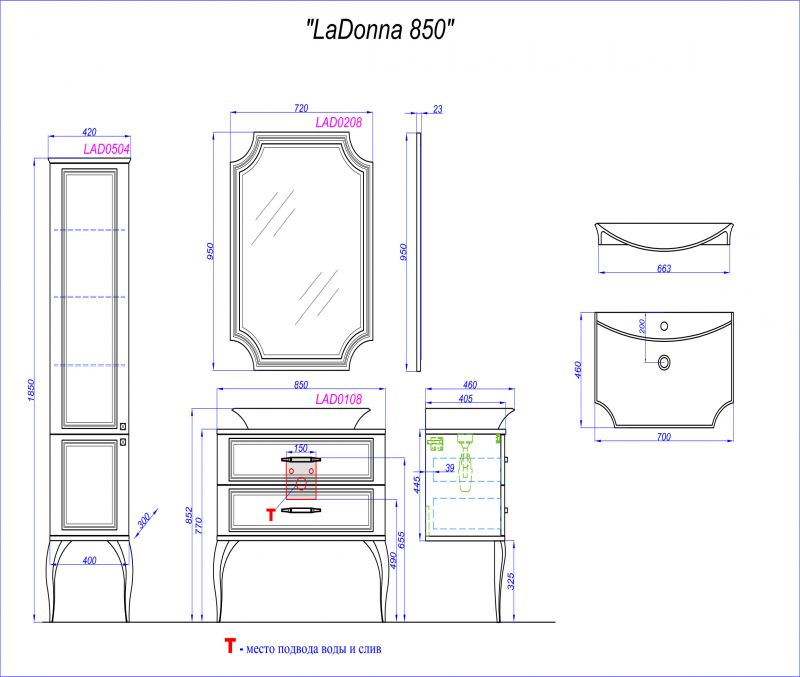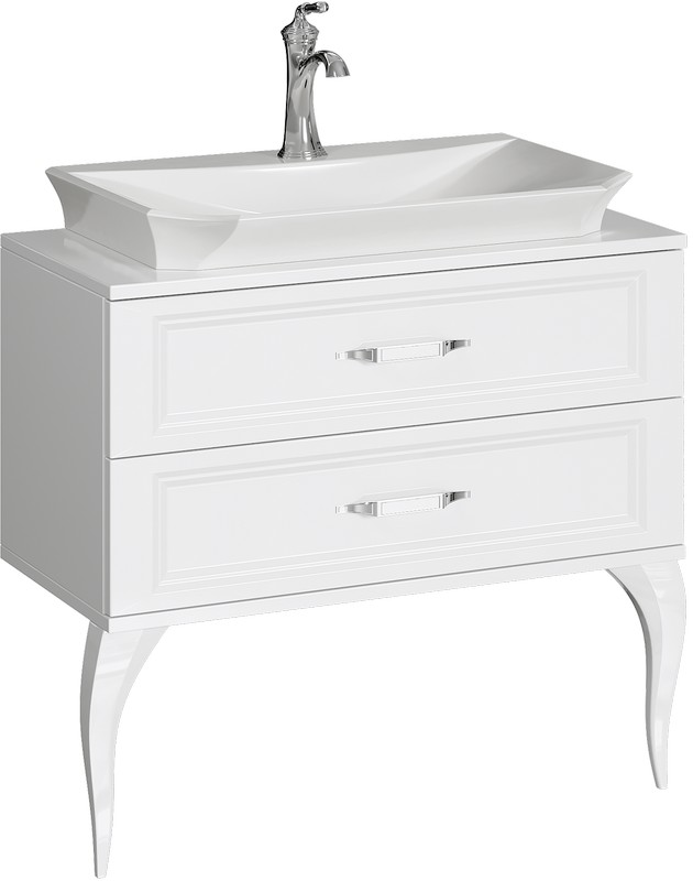 Напольная тумба размером 85 см комплектуется наставным умывальником La Donna (материал литьевой мрамор, производство Польша) и хромированными ручками.