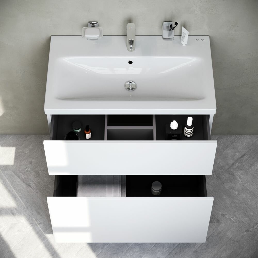 Хотите выделиться при ограниченном бюджете? Трендовый дизайн мебели для ванной комнаты Gem не уступает комплектам по гораздо более высокой цене.