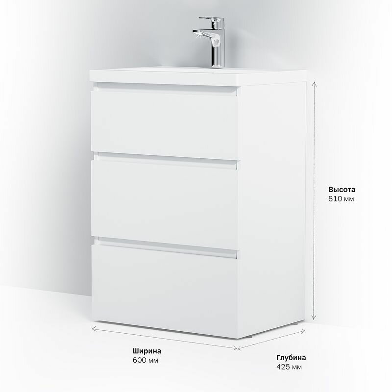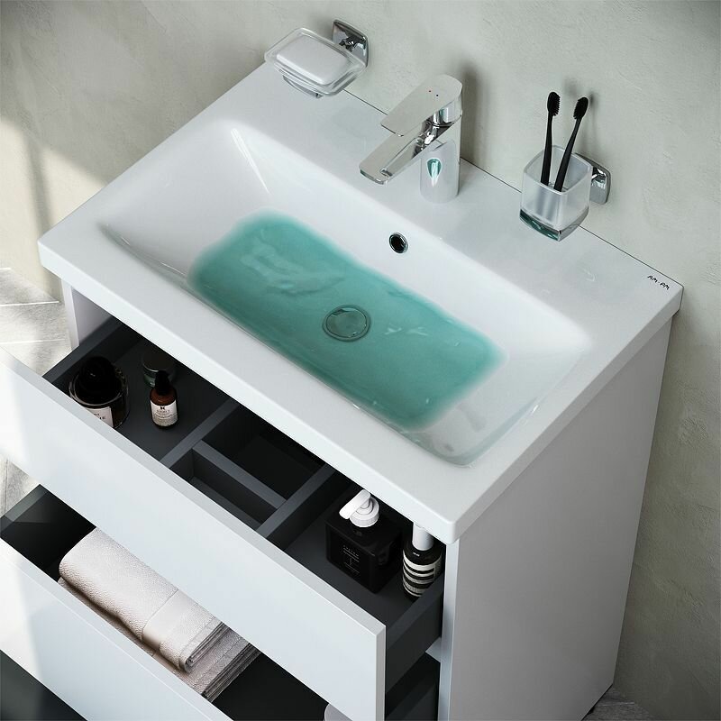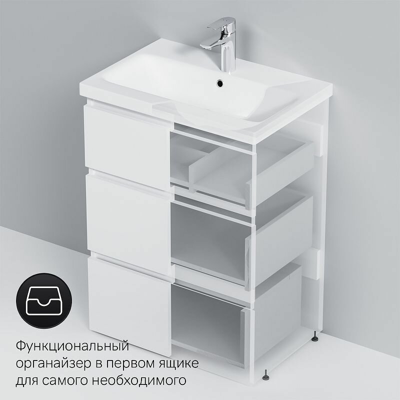Современный европейский дизайн от DanelonMeroni (Великобритания/Италия). Уникальный нижний ящик базы может быть использован как: выдвижная подставка для детей, для удобного мытья рук (выдерживает нагрузку до 60 кг); дополнительная ниша для хранения (экономия пространства ванной комнаты). Ящики с антискользящим покрытием цвета антрацит – европейский стандарт. Повышенная влагостойкость мебели: окрашенные в 7 слоев поверхности мебели в цвете белый глянец , влагостойкая плита мебели в цвете белый глянец.