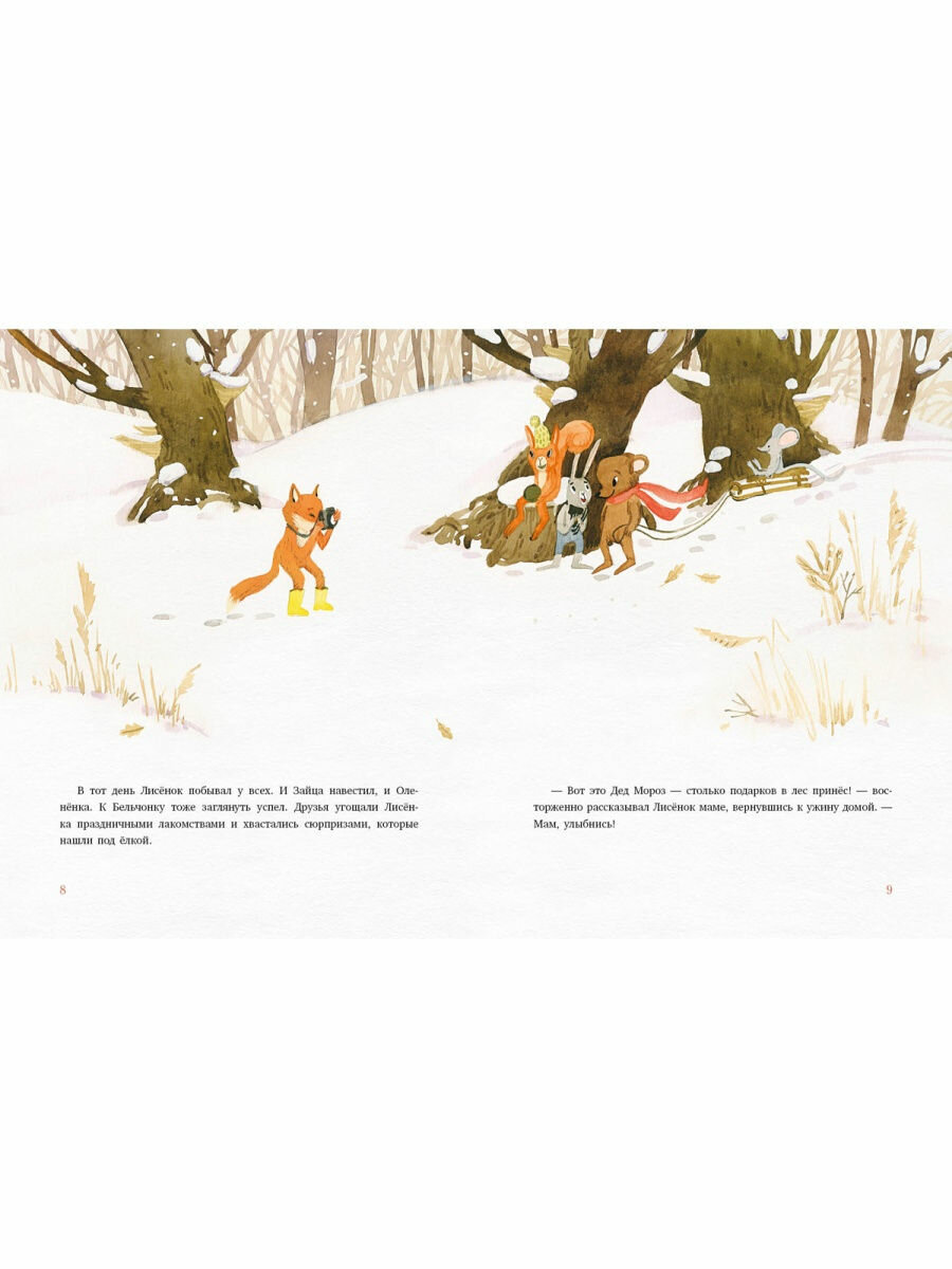 Большинство других сказок про Деда Мороза достаточно банальны. Сюжет развивается вокруг главного героя, которые доставляет подарки и радость по всему миру. Но эта книга исключение, она приятно удивляет! Мало кто задумывается над тем, кто дарит подарки главному зимнему волшебнику. Уверена, многие малыши считают, что он этого заслуживает. Как и Лисёнок из этой сказки, который вместе с друзьями решает устроить сюрприз для Деда Мороза. Сказка уютная, добрая и увлекательная. Очень рекомендую читать зимними вечерами перед сном, чтобы ребёнок видел сказочные сны.