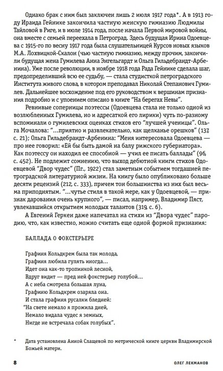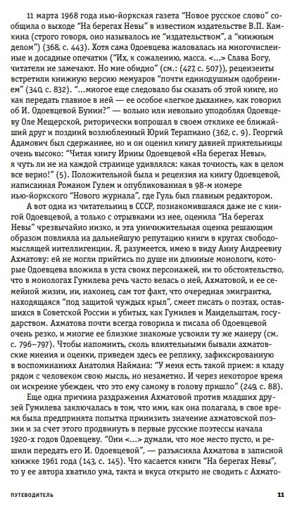 Честно говоря, книга оставляет странное впечатление: я понимаю, конечно, что филологи пошли в массы и кроме филологической прозы и поэзии, у нас еще и филологические исследования для самых маленьких теперь есть, но зачем называть "путеводителем" комментированное издание хорошо известного текста? Получить 400 страниц примечаний вместо исследования плюс к тексту Одоевцовой, который печатается, кажется, без каких-либо изменений- увы. Посредственное издание за непомерную цену.