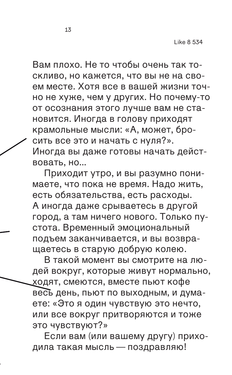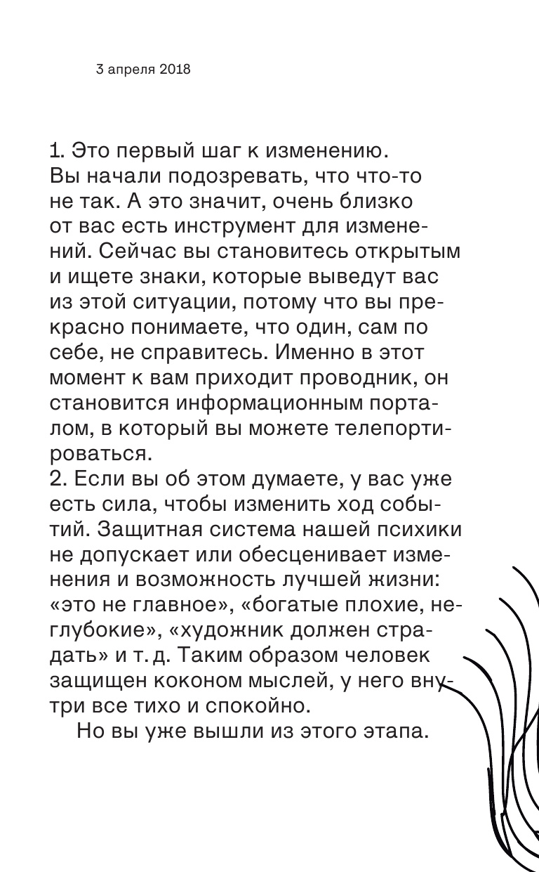Эта книжка о том, как перейти от развития через преодоление к развитию через удовольствие. Она для тех, кто хочет совершенствоваться не от проблемы к проблеме, а через путешествие из хорошего в лучшее. Эта книжка о том, какие осознания происходят с человеком на дороге перемен. О том, как преумножать любовь и через это изменить жизнь.