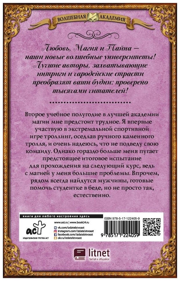 Второе учебное полугодие в лучшей академии магии мне предстоит трудное. Я впервые участвую в экстремальной спортивной игре троллинг, оседлав ручного каменного тролля, и очень надеюсь, что не подведу свою команду. Однако гораздо больше меня пугает предстоящее итоговое испытание для прохождения на следующий курс, ведь с магией у меня большие проблемы. Впрочем, рядом всегда найдутся мужчины, готовые помочь студентке в беде, но не просто так, естественно.