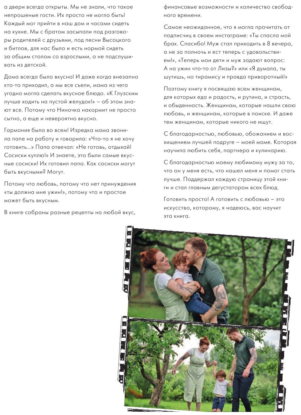 Мне кажется, что я – тот самый собирательный образ подписчиц, о которых пишет Лиза в своей книге: «Самое неожиданное, что я могла прочитать от подписчиц в своем «Инстаграме»: «Ты спасла мой брак. Спасибо! Муж стал приходить в 8 вечера, а не за полночь и ест теперь с удовольствием!», «Теперь мои дети и муж задают вопрос: А на ужин что-то от Лизы?» или «Я думала, ты шутишь, но тирамису и правда приворотный!» все так: тирамису приворотный, готовить с Лизой просто, а как научиться готовить с любовью – вас научит эта книга.