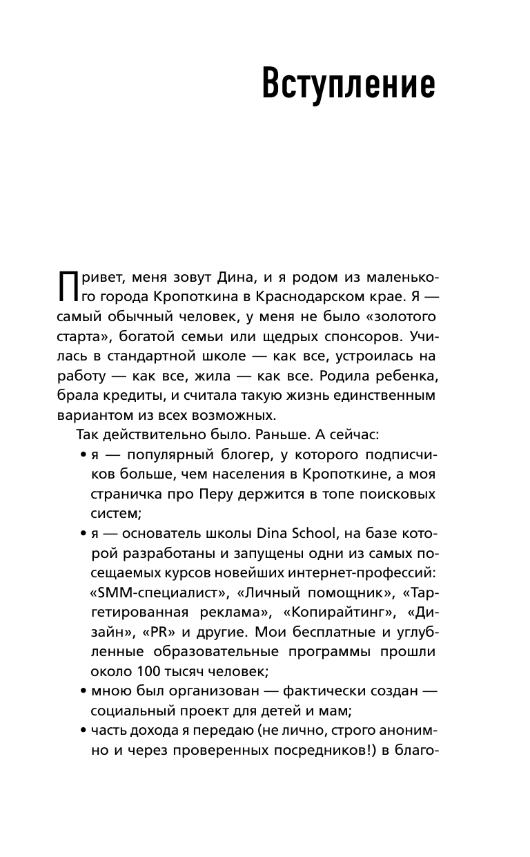 Книга Дины действительно является волшебным пинком в мир удалёнки, читается на одном дыхании, написано с юмором, понятным языком. В книге Дина делится своими знаниями, мотивирует и помогает сделать тот решающий шаг для удаленной работы. Благодарю автора и очень рада, что эта книга попала мне в руки :)