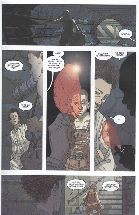 Вообще что можно сказать о втором томе? Не хуже первого. Начинать нужно с первого, а то ничего не поймете, сюжет тут скорее линейный, многое вытекает из того, что мы видели раньше. Рисовка бесподобная, это просто космическое что-то.