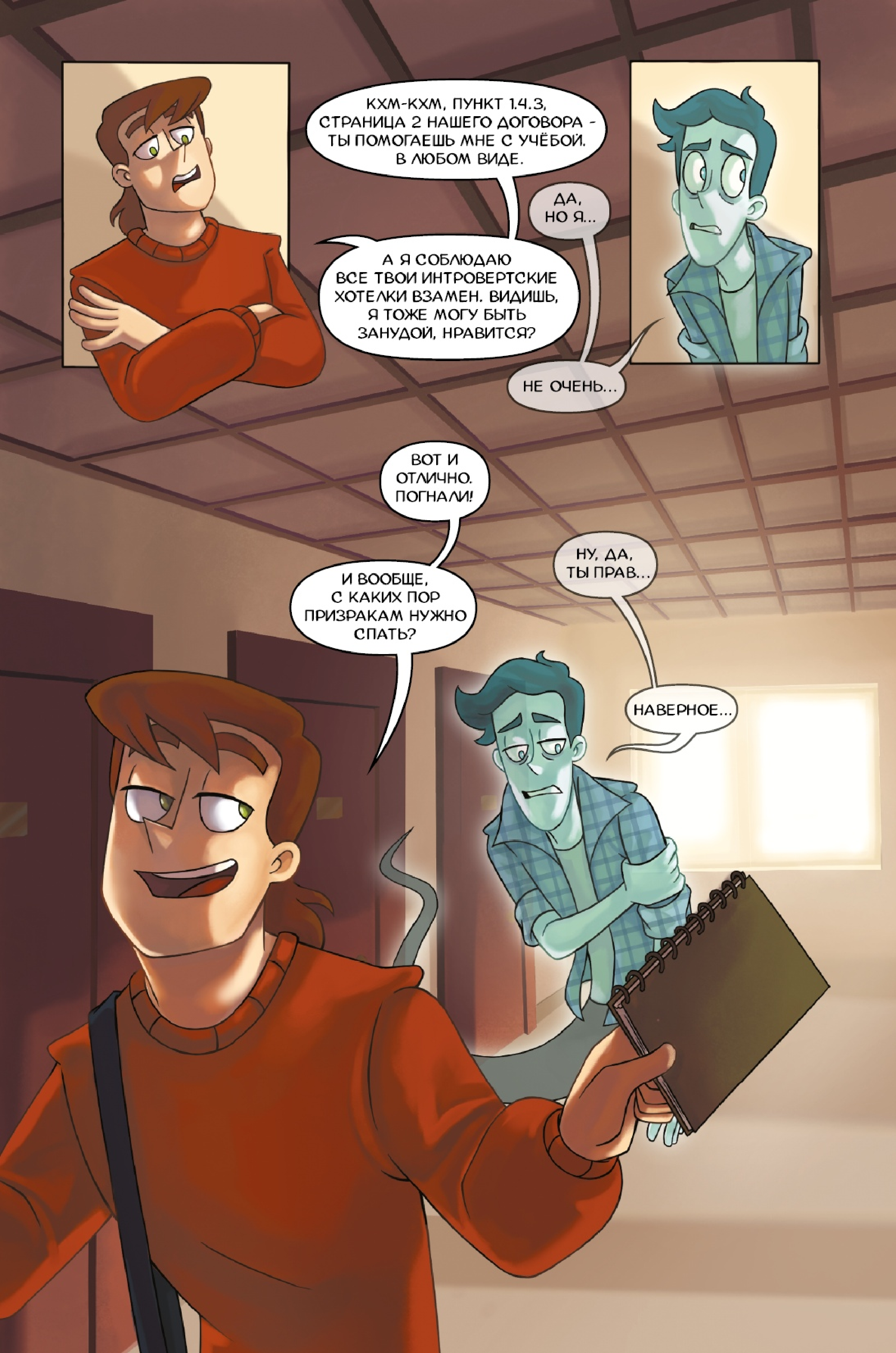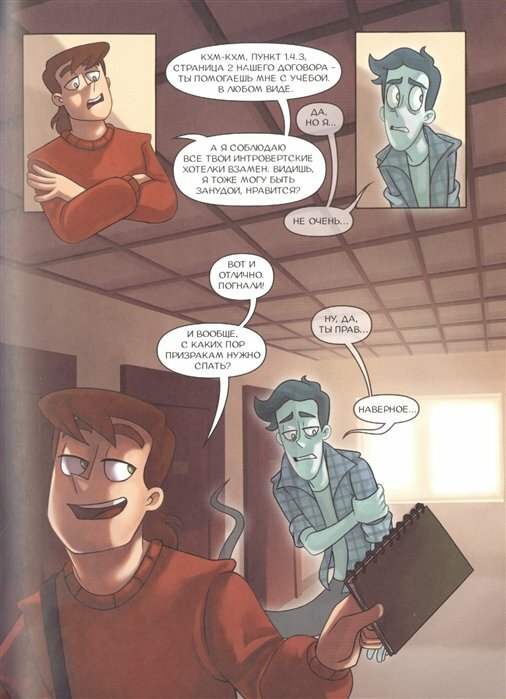 Из рецензии к первой части плавно перетекаем во второю часть книги.Что я могу сказать начнём с главной проблемы и то и за чего меня так сильно разрывает.Страниц стало больше это конечно хорошо вот только на середине в место полноценных страниц вас ждут арты то на чёрном то на белом фоне иногда разбавленная страницами вообще без ничего.Это полнейшее свинство и не уважение к фанатам.Ну ладно чёрт с ним но с сюжетом то что.По сюжету мультсериала главный герой и призрак мирятся и начинают жить мирной жизнью друг с другом но сюжет комикса обнуляет эту сюжетную линию по комиксу главный герой снова мудак.Весь комикс он эксплотирует призрака и это сделано просто потому.Создательницы самого комикса в одном из интервью после выхода пилотной серии мульта обещала проработанную вселенную и это та самая проработанная вселенная где сюжетная линия будто написана в отрыве от серии мульта.Ну спасибо.В общем это сплошное разачарование.Брать не советую.