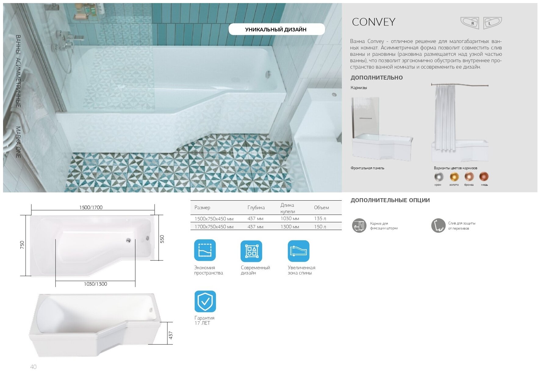 Акрилловая ванна Convey - отличное решение для малогабаритных ванных комнат. Ассиметричная форма позволит совместить слив ванны и раковины (раковина размещается над узкой частью ванны), что позволит эргономично обустроить внутреннее пространство ванной комнаты и осовременить ее дизайн. Несмотря на небольшие габариты, ванна Convey удобна для купания людей любого телосложения благодаря купели особой формы. Данная позиция включает в себя только ванну. Опции (ножки, шторки, панели) доступны отдельными позициями.