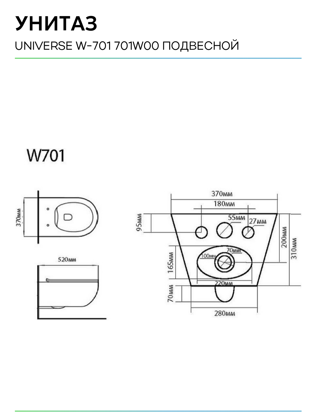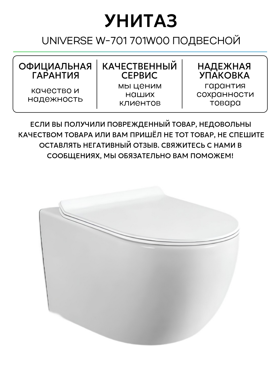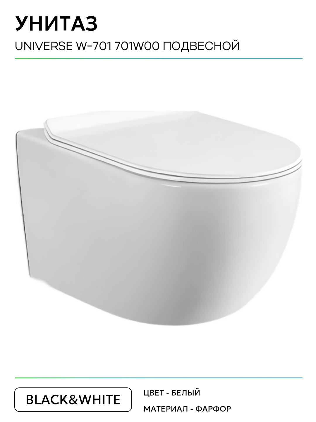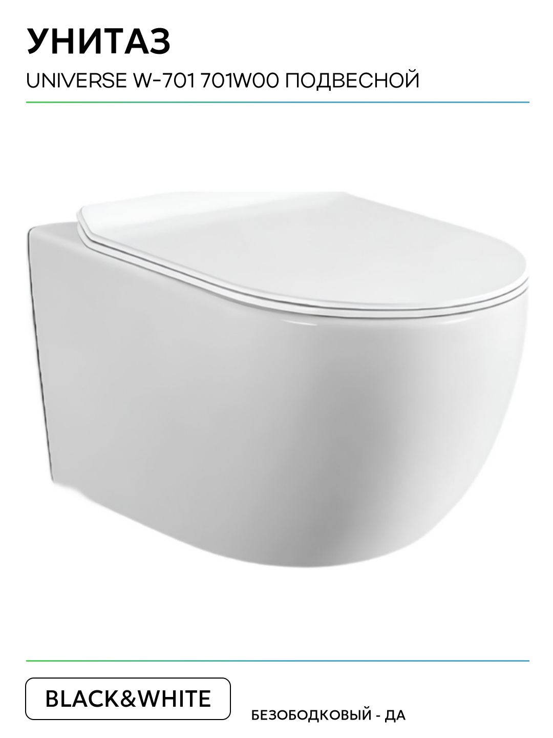 Подвесной унитаз Black&White Universe W701 имеет высокую гигиеничность за счет отсутствия ободка, современный дизайн и конечно, качественное, устойчивое к царапинам и впитыванию загрязнений покрытие Anti-Dirt.