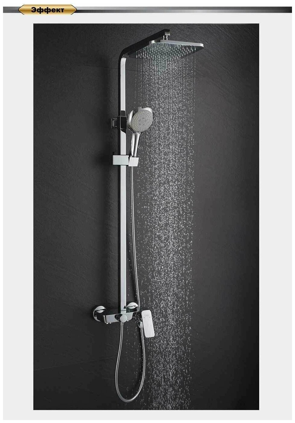 | Комплект поставки | душевой шланг, душевая лейка, душевая штанга, держатель для душевой лейки, верхний тропический душ, кронштейн |