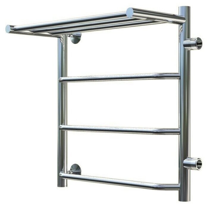 Полотенцесушитель типа "лесенка" с боковым подключением трапецевидными вставками с полкой. Серия 1 предполагает равномерное размещение вставок. Полотенцесушитель имеет наружнюю резьбу на боковых выводах. В комплекте имеются заглушка с краном маевского и телескопические держатели.