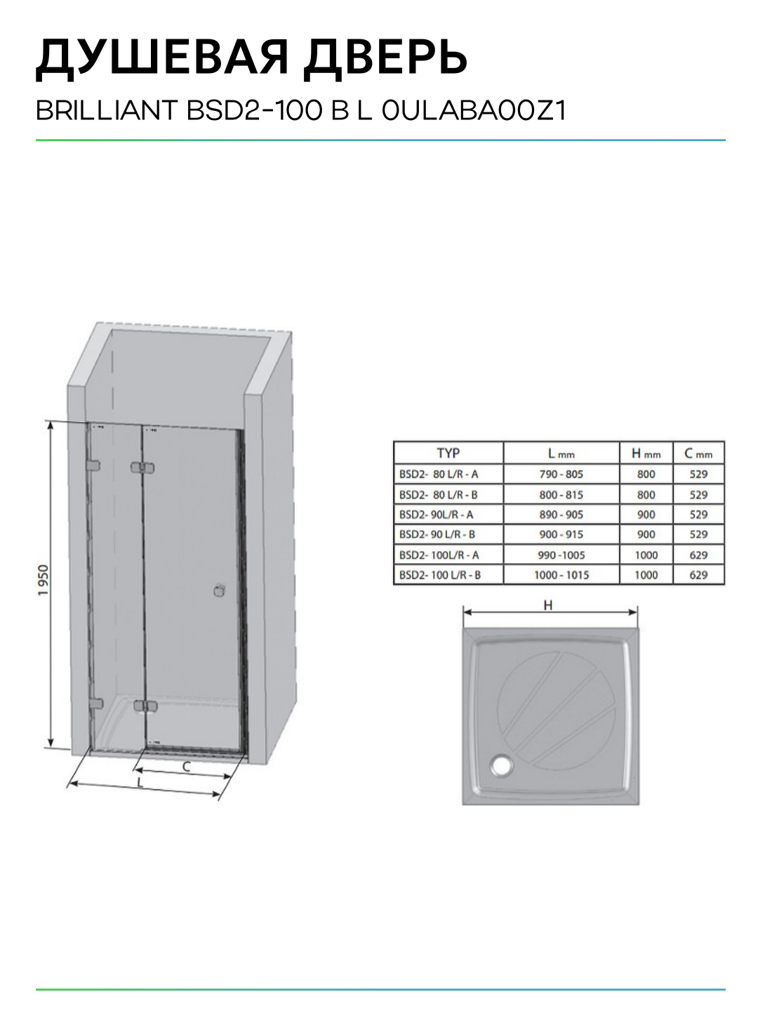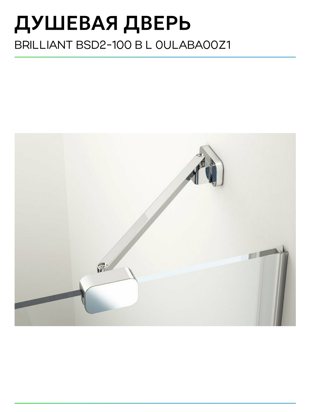 Душевая дверь Ravak Brilliant идеальна для установки в нишах шириной 100 см и может приспосабливаться к строительным неровностям в диапазоне от - 10 до + 5 мм. Состоит из двух прямых частей: поворотной двери и неподвижной стенки. Устанавливается в облицованный кафелем угол ванной комнаты на поддоны Ravak Perseus, Perseus Pro, Perseus Pro Flat, Perseus Pro Chrome, Gigant, Gigant Pro, Gigant Pro Flat, Gigant Pro Chrome или непосредственно на пол со встроенным душевым каналом.