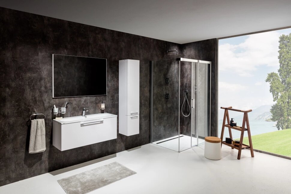 Роскошный раздвижной уголок, созданный с помощью комбинации душевых дверей и неподвижной стенки. Выберите необходимые части в зависимости от конкретных размеров Вашей ванной комнаты и создайте максимально удобное душевое пространство. Неповторимый дизайн с доминирующими массивными верхним и боковым профилями.