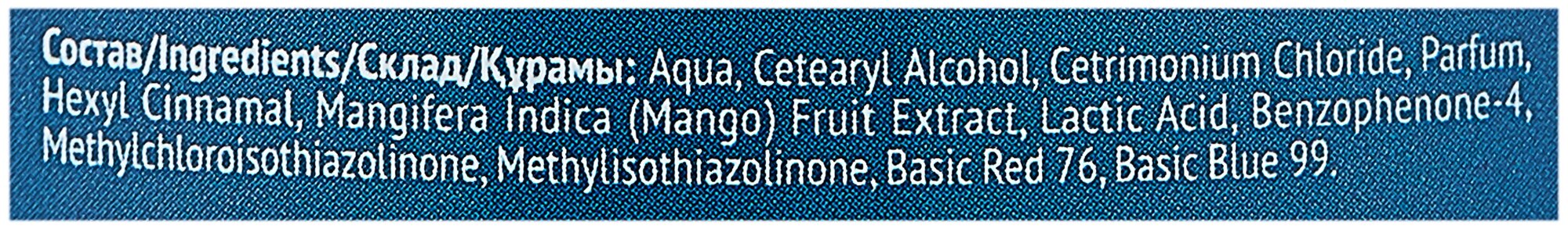 | Состав | Aqua, Cetearyl Alcohol, Cetrimonium Chloride, Parfum, Hexyl Cinnamal, Mangifera Indica (Mango) Fruit Extract, Lactic Acid, Benzophenone-4, Methylchloroisothiazolinone, Methylisothiazolinone, Basic Red 76, Basic Blue 99 |
