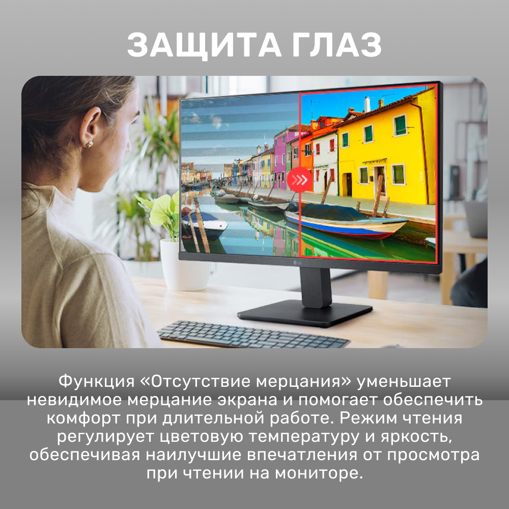 Модель поддерживает стандарт HDR 10, технологию отсутствия мерцания Flicker safe, динамическую синхронизацию изображения FreeSync, имеет специальный режим для чтения и стабилизатор черного цвета. Экран откалиброван производителем для возможности возвращения к изначальным настройкам. Эргономичная подставка позволит настроить угол наклона монитора в диапазоне от -5° вперед до 20° назад.