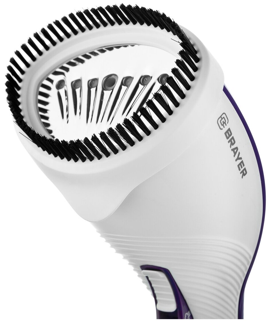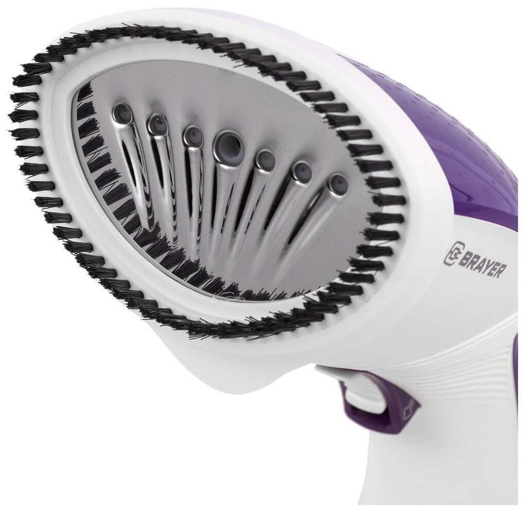 Компактный ручной отпариватель BRAYER представлен в белом корпусе с контрастными фиолетовыми вставками и удобным для удержания дизайном. Устройство дополнено удобным регулятором мощности и резервуаром для 220 мл воды. Прибор готов к работе уже через 35 секунд после включения. На корпусе BRAYER имеется визуально понятный индикатор включения. Работа осуществляется с потоком пара 25 г/мин. Прибор поставляется вместе с ворсовой щеткой, а подключается к сети с помощью кабеля длиной 1.9 м.