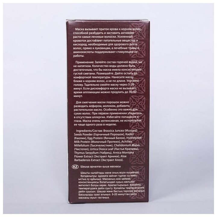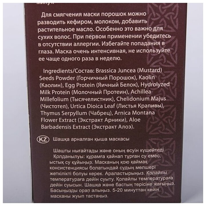 Залейте состав горячей водой, не кипятком. Количество воды должно быть достаточным, что бы маска имела консистенцию густой сметаны. Размешайте. Дайте остыть до комфортной температуры. Нанесите маску ближе к корням волос, а не по длине. Укутайте голову. Тщательно смойте маску через 5-20 минут. Если дискомфорта маска не вызывает, время аппликации можно продлить до 30-40 минут.ШТРИХКОД