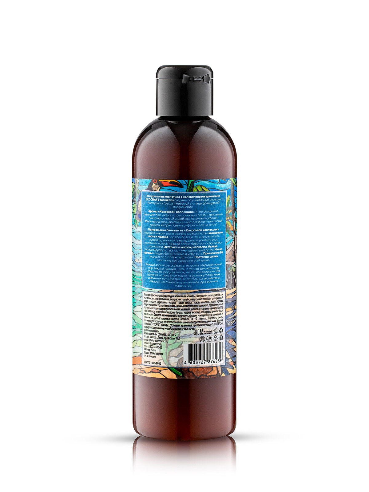 Натуральный бальзам из «Кокосовой коллекции» содержит максимально возможное количество кокосового масла и молока, что позволяет интенсивно укрепить луковицы, уменьшить выпадение и ускорить рост, увлажнить волосы по всей длине, бороться с секущимися кончиками. Экстракты кокоса, магнолии, банана активизируют рост волос и уменьшают выпадение. Масло арганы придает блеск, сияние и упругость. Провитамин В5 защищает и питает кожу головы. Протеины шелка разглаживают волосы по всей длине. Аромат «Кокосовой коллекции» - это роскошные, манящие Мальдивы с их белоснежным песком, кристально чистой бирюзовой водой, шелестом волн, криком тропических птиц, диковинными садами, полными спелых кокосов, и коралловыми рифами – рай на земле!